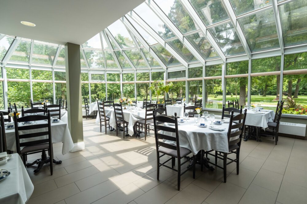 This quaint and charming reception venue is perfect in any season, surrounded by spring blossoms, lush summer flower beds, vibrant fall foliage or sparkling in a Victorian-style winter setting. Capacity: Up to 130 people